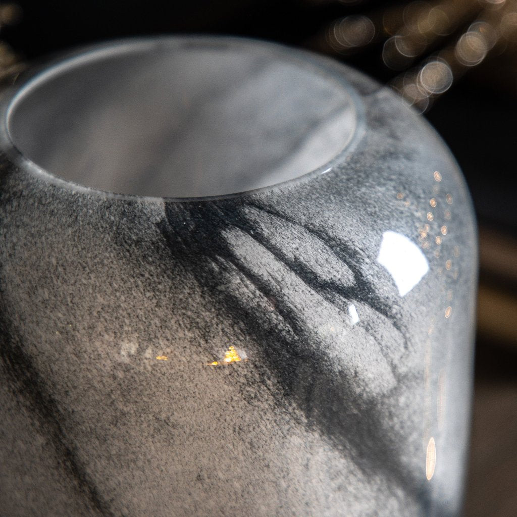 This battery-powered lamp is great for adding an ambient glow to any area of your home. The glass shade has a black marble effect finish and sits on a gold metal base.